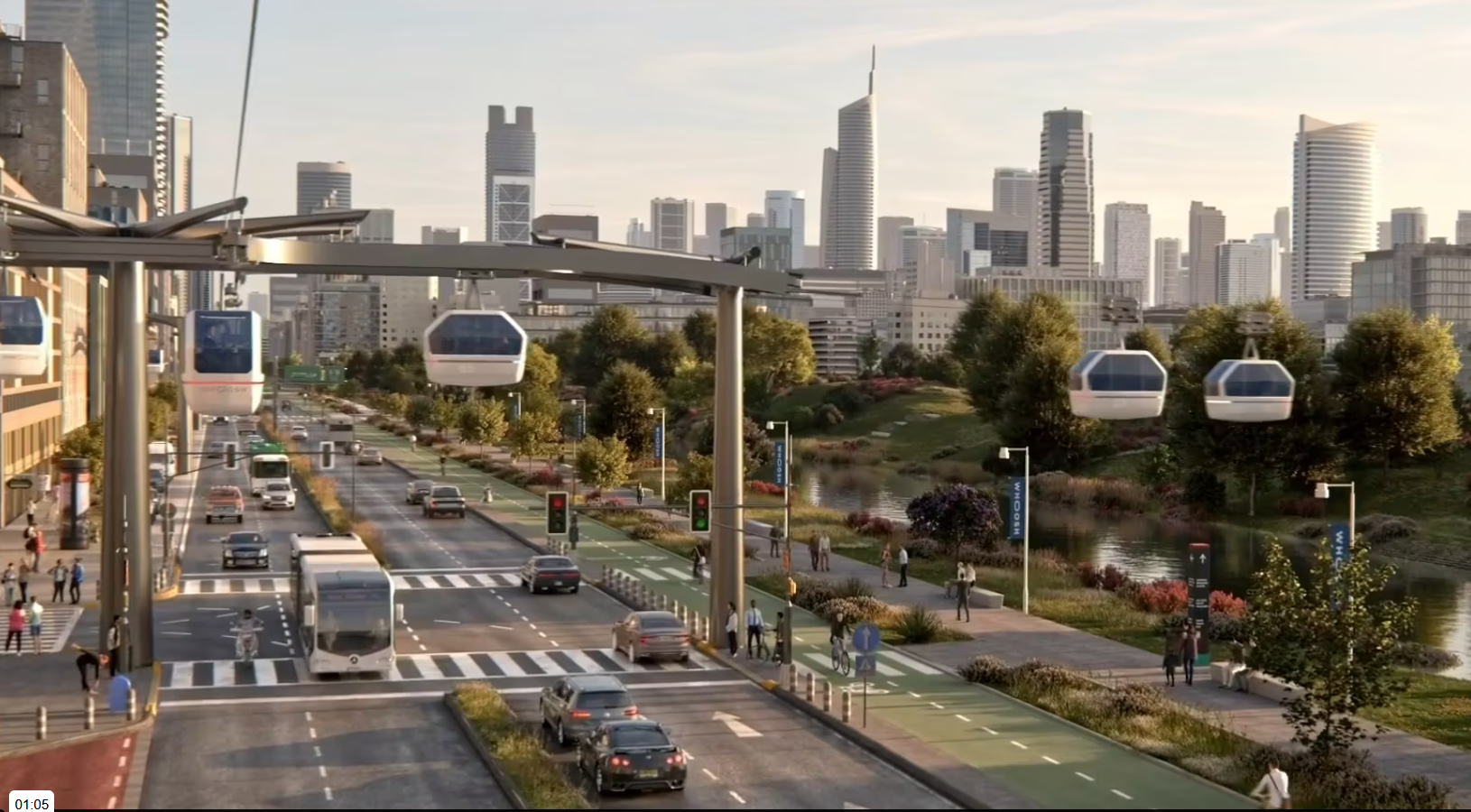 A New Zealand-based company, Whoosh Solutions, is building a new kind of urban transit system – a network of overhead fixed cables that are used by self-driving battery-powered gondolas to go from point to point. They can switch from one cable to another, unlike regular gondola systems, and so can take any route through a network to get around without having to change cars or stop. They let people on and off at stations every few blocks at ground level: