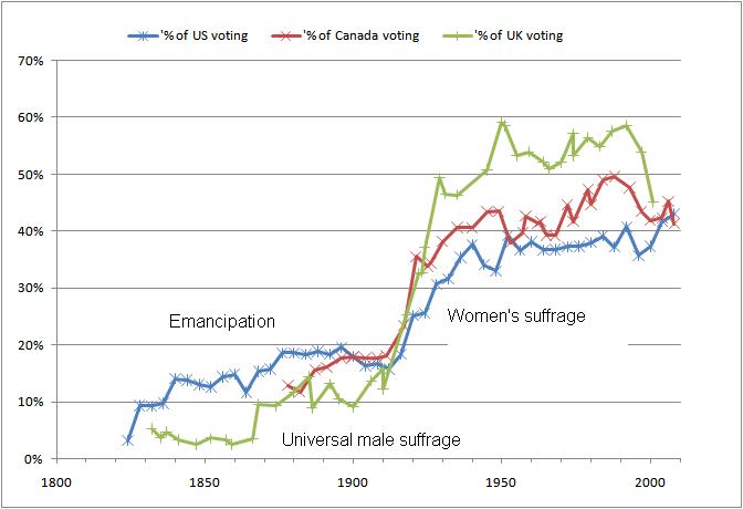 The US data is for presidential elections; Canada and the UK are for Parliament. All three countries had elections before the first dates shown here, but didn’t record the popular votes. The UK and US had surprisingly low rates in the early 19th century – just a few percent. The big jump happened in the 1920s when all three countries granted women the right to vote. The rate more than doubled, so apparently everyone was encouraged to participate. Perhaps more men were egged on by their wives.