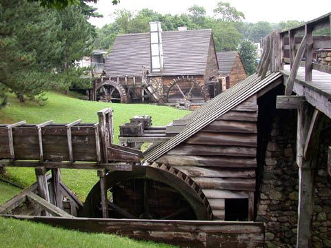 It’s a reconstruction of the first blast furnace and iron works in the US. It had its first pour in 1648 and last in 1668. The site was lost for centuries, until archaeologists uncovered it in the 1950s. They found the original hammer for the rolling mill (a 500-pound chunk of iron), found the remains of the wooden water wheels, and found the foundations of the brick furnace itself. Then volunteers found the plans and rebuilt the entire site, re-creating both the mechanisms and the buildings.