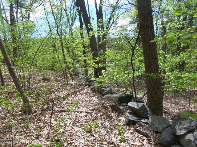 The woods around here are full of these old stone walls. 18th and 19th century farmers would haul the boulders out of the fields to make them plowable, and pile them up as rough border fences. They’re actually of some value these days as building materials for suburban walls, since they have nice patterns of lichen growing on them.