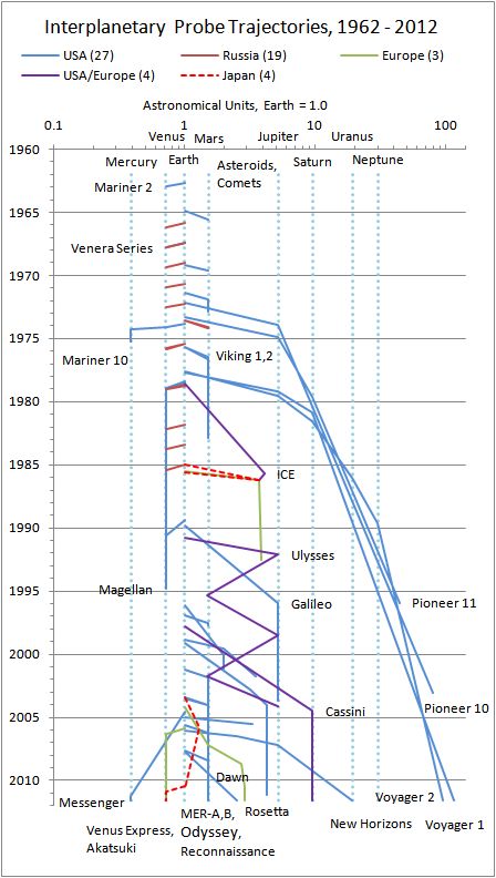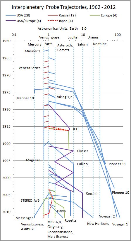 So I decided to look for myself at how space science activity has increased and decreased over the 50-odd years of the Space Age.   How many robots have been operating in deep space by year?  I took this List of Interplanetary Voyages  and plotted where and when the 59 successful probes have flown: