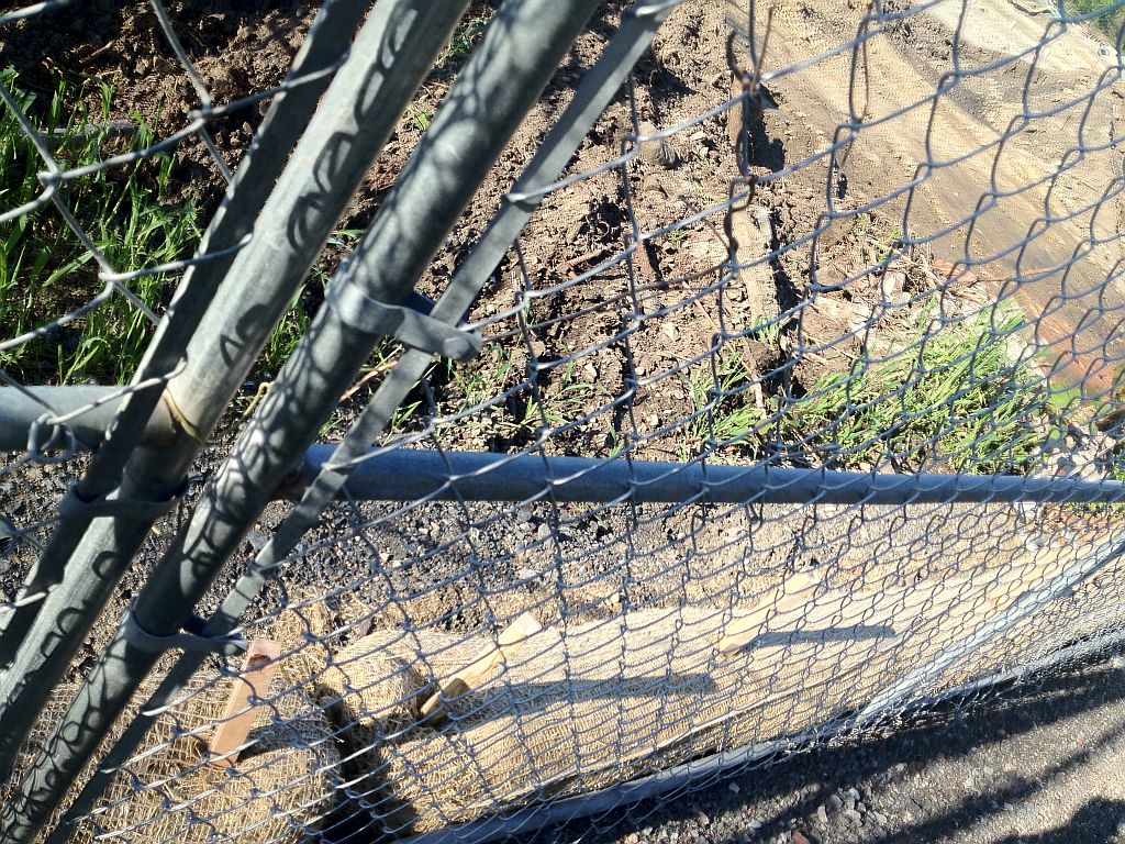 There’s a reason why this path is so smooth and dry – it’s underlain by plastic sheeting. This whole area is actually a marsh. The plastic keeps water from coming up, and weeds from sprouting up through the path. On the far side of the brook is a fence: