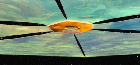 “Spacecraft in sailing configuration. The spacecraft is supported by three struts in an 11-m hole inthe center of the solar sail. A gold sun-shield covers the hole. Sail control is achieved by moving the spacecraft with respect to the center of mass of the sail by changing the length of the three struts. The gold is a sun-shield covering the hole.”