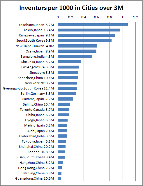 Japan and Korea dominate. I’ve never been to Korea, but I can say that whenever you visit Japan it’s clear that these are a people who delight in skill. Bangalore, the red-hot heart of Indian tech, is #7, and the first non-Asian city on the list. Los Angeles, New York and Berlin are the large inventive Western cities, and are similar at about 1 inventor per 3000 people. Madrid is unexpected, and a bit ahead of London. Paris actually does very well at 0.6 inventor/1000, but its nominal population is only 2.2M, so it missed the cutoff.