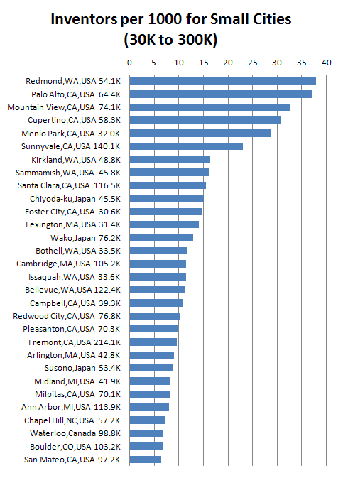 Hsinchu is the richest city in Taiwan, and the home of the chip foundries TSMC and UMC. Note that the scale here is about 10X that of the large cities. Hsinchu has about 4000 inventors – as many as Yokohama even though it’s 10X smaller. After it come San Jose and San Francisco, the south and north anchors of Silicon Valley. Seattle, Austin and San Diego have their charms for coffee, music, and surfing. Dixie is represented by Raleigh at #13, the anchor of North Carolina’s Research Triangle, a quite deliberate piece of government interference in the economy.