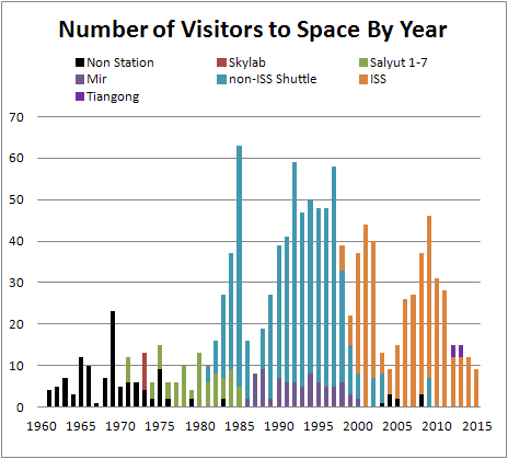 The numbers have dropped a lot in recent years with the retirement of the Shuttle in 2011. Only about 12 people are going up to the ISS every year, but they’re staying for a lot longer.