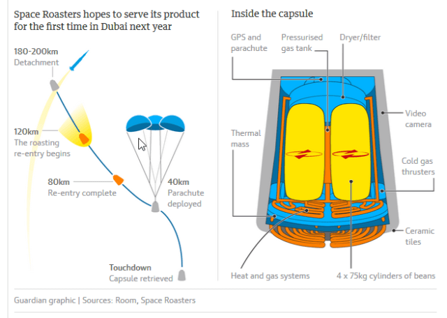 During re-entry the capsule would experience several gees of deceleration, so the diagram makes no sense. They must mean a short sub-orbital hop where the roasting can be done while the beans float around. The capsule would splash down somewhere near Dubai, where they would sell it for €100 a cup. At 60 cups per kilo and 300 kilos per flight, that’s about $2M per flight, which might be reasonable for the Virgin Galactic ship or the plethora of small rocket companies that have been springing up.