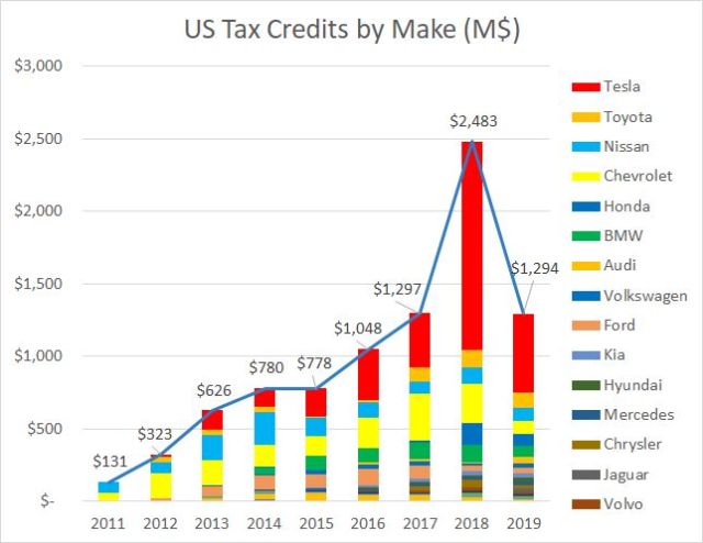 The biggest year was 2018 when at most $2.4 billion would have been granted. The actual amount could be much less, depending on how many people filed for it. Even that was only 0.06% of the US federal budget. The budget can’t even be tracked to that precision. It dropped in 2019 to $1.3B because the Tesla credit was way down. Chevrolet hit the 200K limit in April 2019, and its credit will expire in April 2020, so it was down too. Nissan has sold 140K all told, and Toyota and Ford are at 120K, so they’re not all that close.