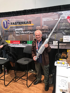 But there’s s sequel! Uli could not stay idle in retirement, and started a new firm, U2 Fasteners, in 2016. They have even more advanced features, like a bulge on the shaft that opens the wood up as it screws in, and little cutters under the cap that improve the counter-sinking. Here he is at a trade show with a model of one of his products: