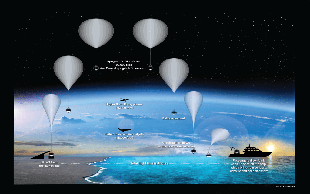 There are several firms looking to offer this, but the furthest ahead is Space Perspective. They’re actually based on Cape Canaveral. They plan to offer 6-hour flights for $125,000 – two hours to get up to 100,000 feet (30 km), two hours to admire the incredible view, and two hours descending as the balloon deflates, and then a splashdown in the Atlantic: