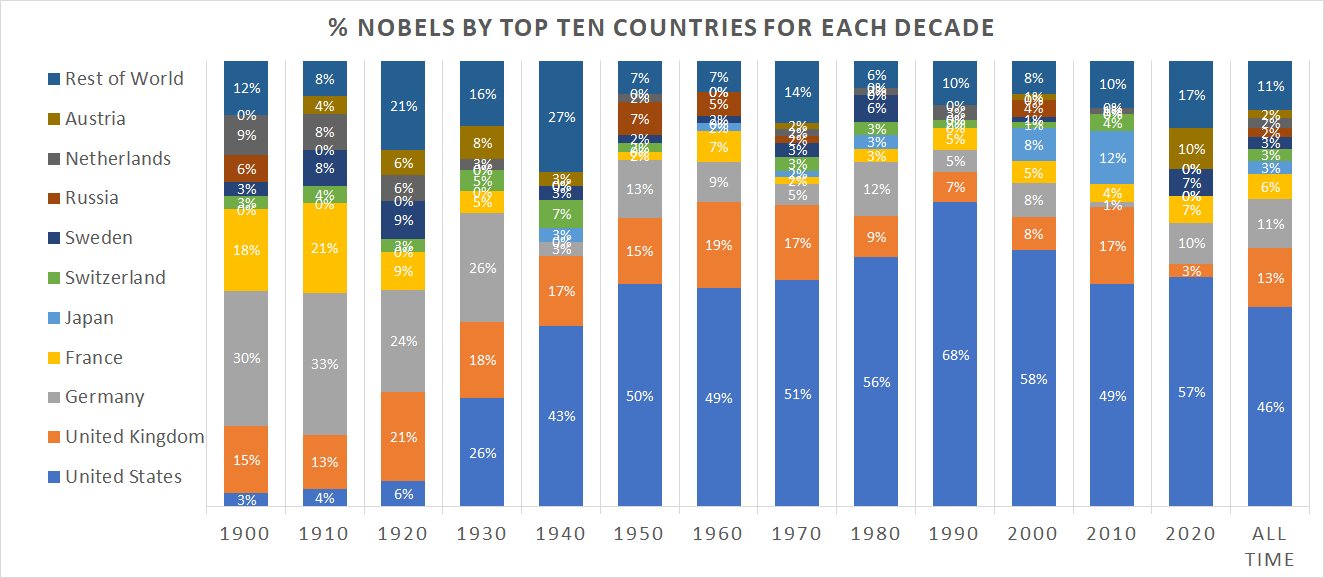 Germany (in gray) dominated up until 1940, when they were distracted by other matters. The UK (in orange) has chugged along nicely throughout. France (in yellow) did well until the 1910s, when WW I wrecked the country. Japan (light blue) has done well recently. Switzerland probably gets the most per capita.