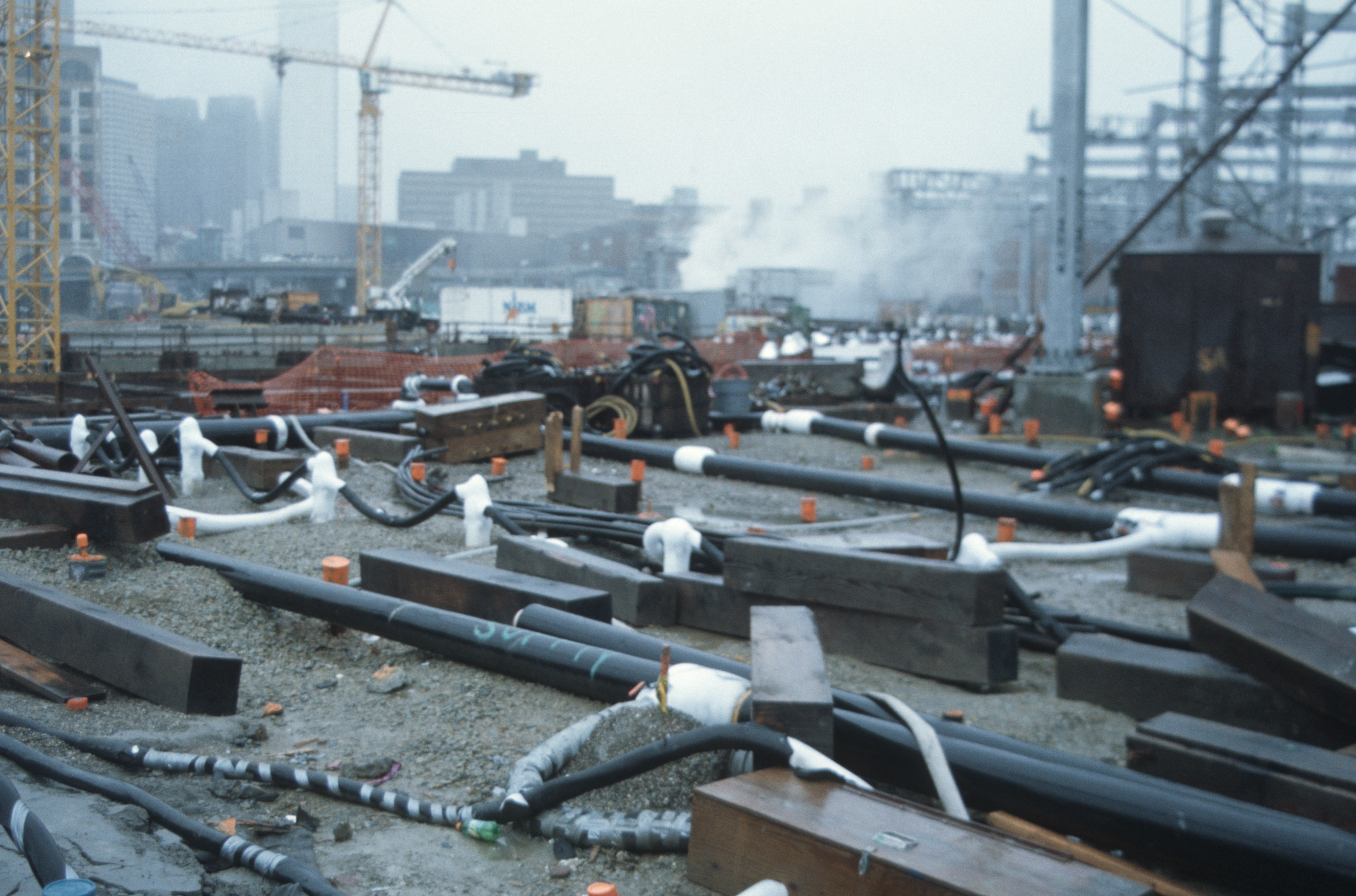 This is looking south from South Station. The main tracks are in the center, and three tunnels (one on the bottom, one on the left, and one in the upper left) are converging to merge beneath the tracks before going under Fort Point Channel and then Boston harbor. The tunnels can be dug down from above and then the sections cast and rammed into place.