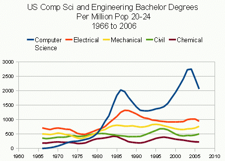 Now, of course no one deserves to have a billion dollars. The people here are capable, but they are not thousands of times more capable than others. It’s a sign of how broken the incentive system is in US-style capitalism. A few take all the gains and the rest get out-sourced to Bangalore. There are fewer and fewer prospects for having a middle-class career in technology. No wonder students aren’t drawn to it, as I discussed here. This winner-take-all approach has become the subject of a lot of discussion, but it’s clearly something that has to be fixed.